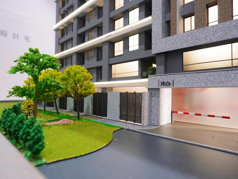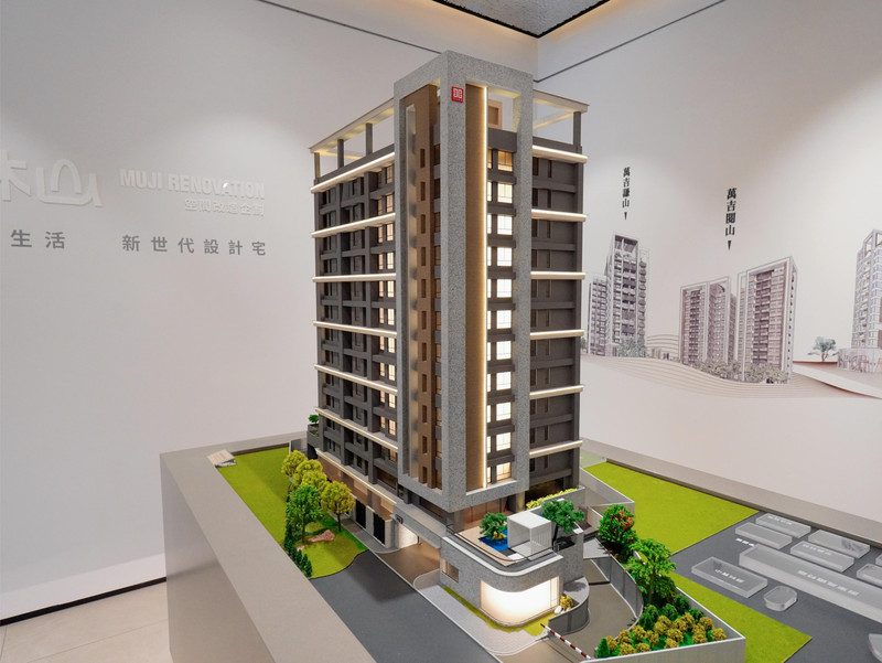 除了MUJI RENOVATION規劃實品屋外,「萬吉沐山」外觀跟公設同樣融合日系風格,建築外觀透過框架線條勾勒建築輪廓,以灰、白、木頭色系為主軸,呈現現代俐落簡潔風格。