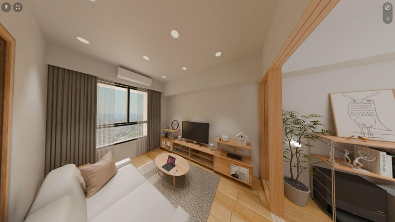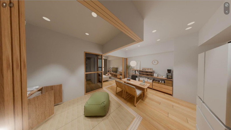 這次最讓人期待的,其實是「萬吉沐山」未來完工後,由「 MUJI RENOVATION 空間改造企劃」規劃的實品屋。約 26 坪的兩房空間,目前透過 VR示意呈現,雖然是中間戶,透過側邊開設天井引入光線,讓室內擁有雙面採光的通透感,兩間臥房與衛浴也都能對外開窗,整體空間感比想像中更開闊、也更舒適。